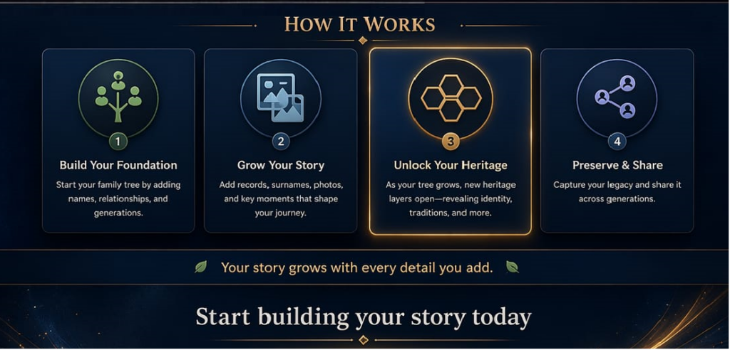 Build your family tree from the ground up-document names, relationship and milestones in a structured and secure space designed to preserve your lineage for generations to come”